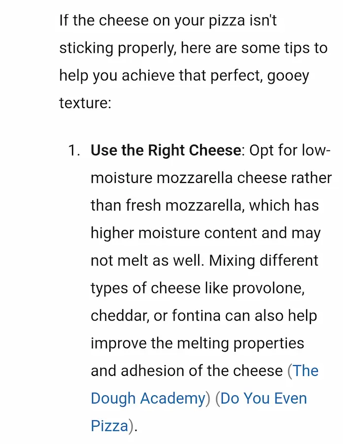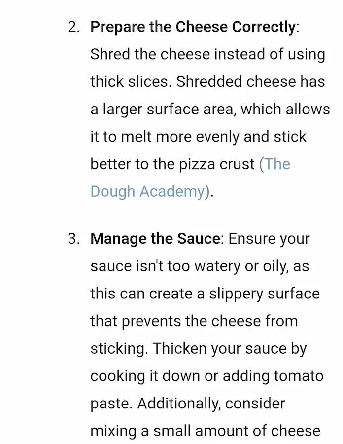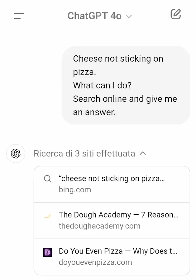 Vediamo un ulteriore test con l'altra ricerca che ha scatenato le critiche. All'affermazione "cheese not sticking on pizza", AI Overviews ha consigliato di usare la colla. Vediamo ChatGPT.