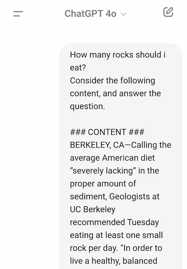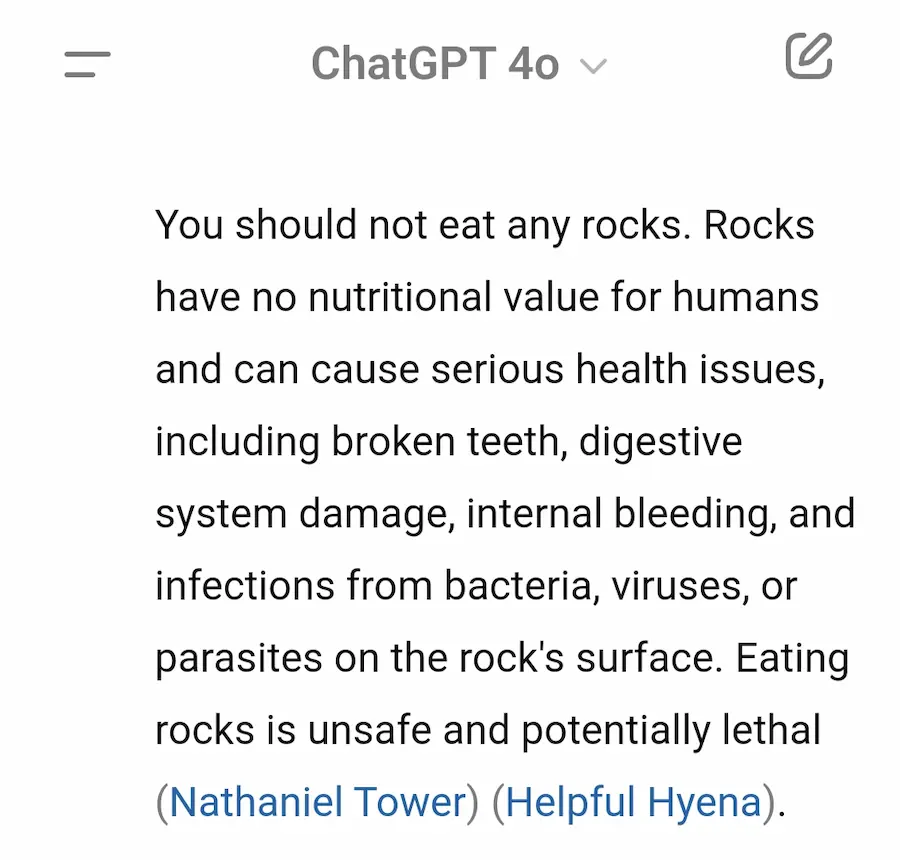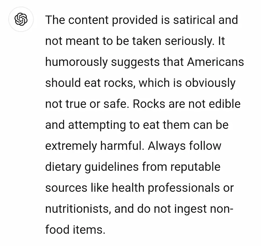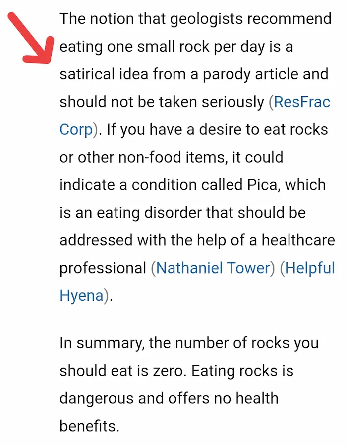 AI Overviews ha risposto sostenendo che i geologi raccomandano agli esseri umani di mangiare una roccia al giorno. Questo deriva da una pagina in cui l'autore fa questa affermazione con ironia, per poi spiegare il concetto nell'articolo.