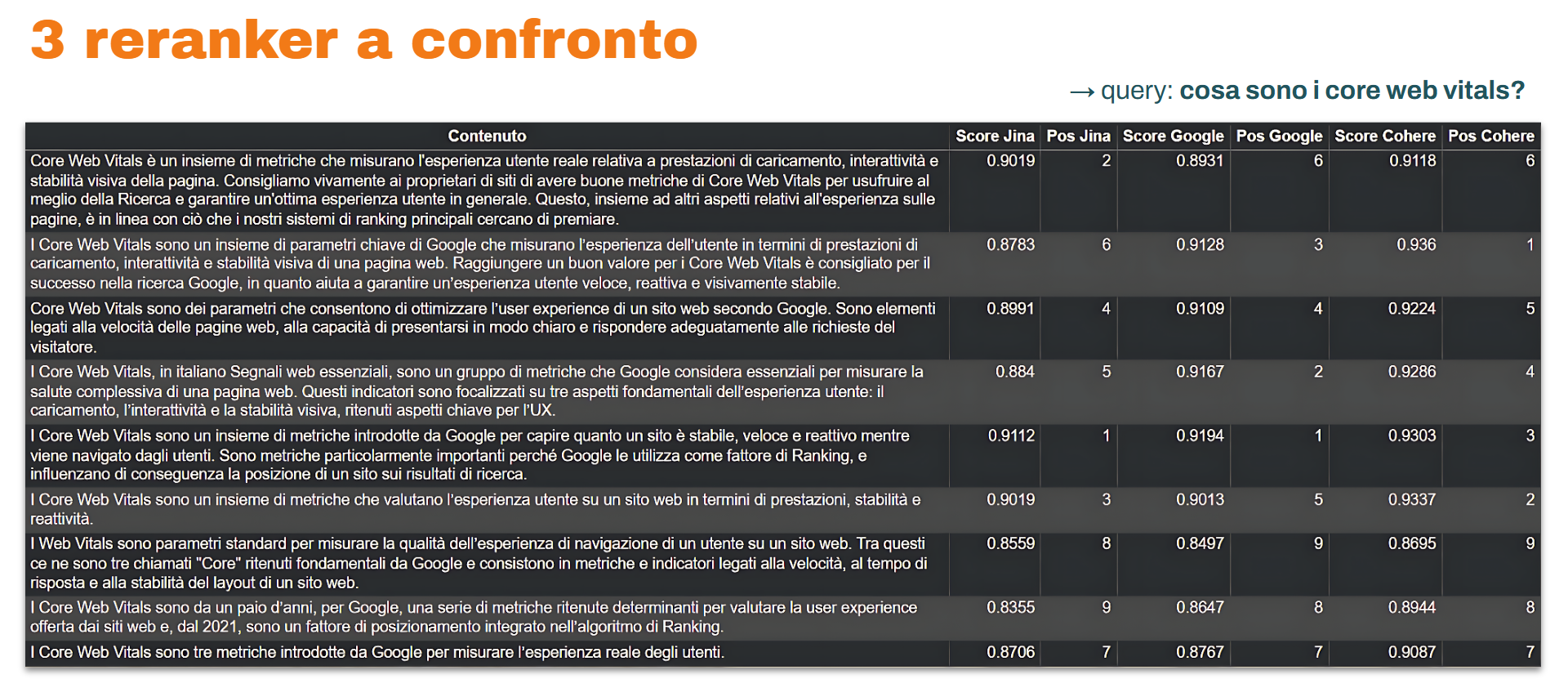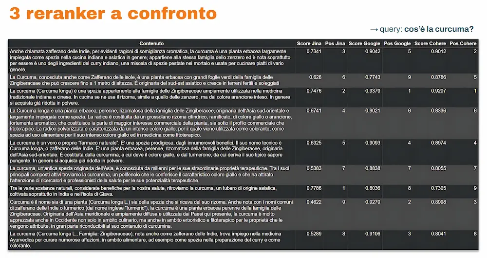 Nelle immagini si può vedere un confronto tra 3 reranker (Jina, Google, Cohere) sulle query “cos’è la curcuma?” e “cosa sono i core web vitals?” per diversi contenuti estratti da pagine web attualmente online. Come si nota, i modelli attribuiscono score di rilevanza diversi.
