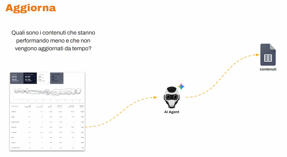 Un agente osserva in modo costante i dati di Search Console ed estrae i contenuti che stanno performando meno (in termini di clic, impressioni e posizionamento), e che non vengono aggiornati da diverso tempo.