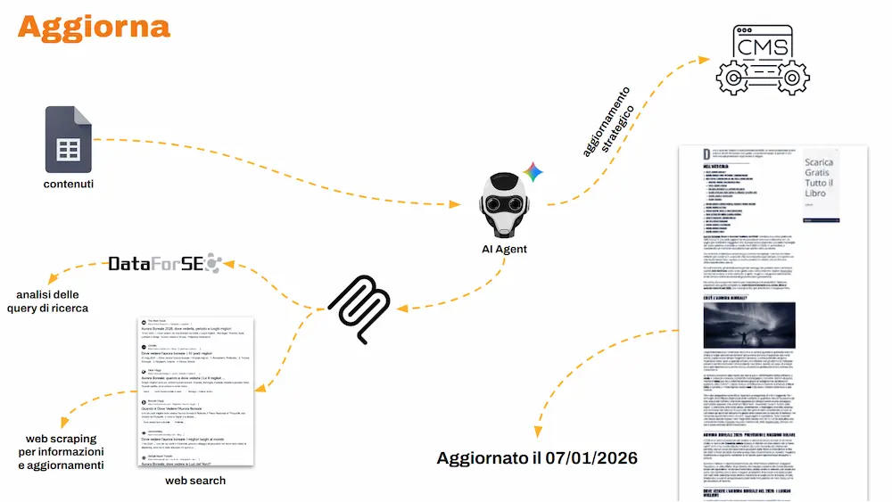 Un altro agente processa questi contenuti, usa tool esterni via MCP, e si occupa di aggiornarli e ottimizzarli, salvando l’elaborato direttamente nel CMS.