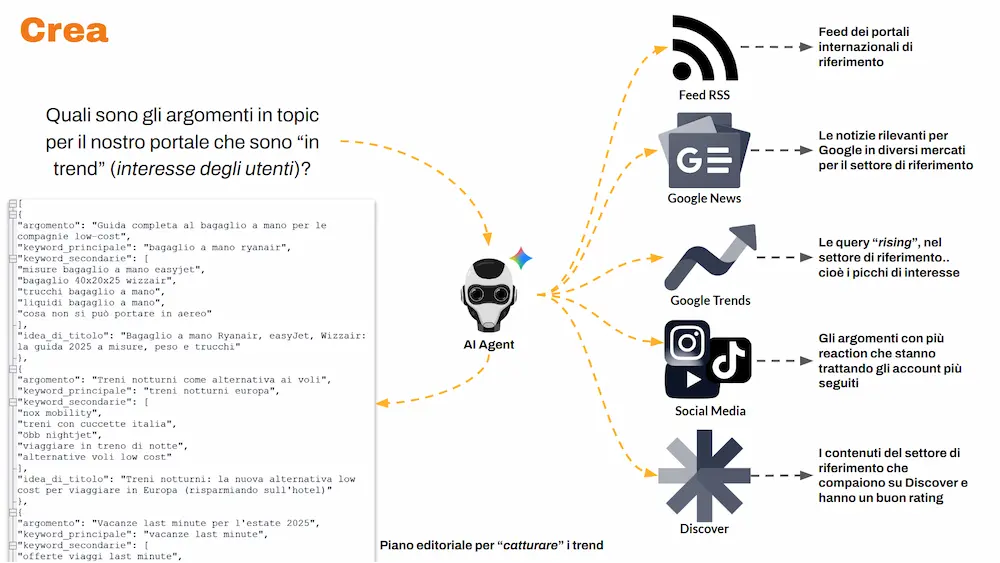 Processa questi dati e produce un piano editoriale sul trend, pensato per "catturare" i trend "istantanei", cioè quello che è interessante per gli utenti nel momento in cui si esegue l'osservazione.