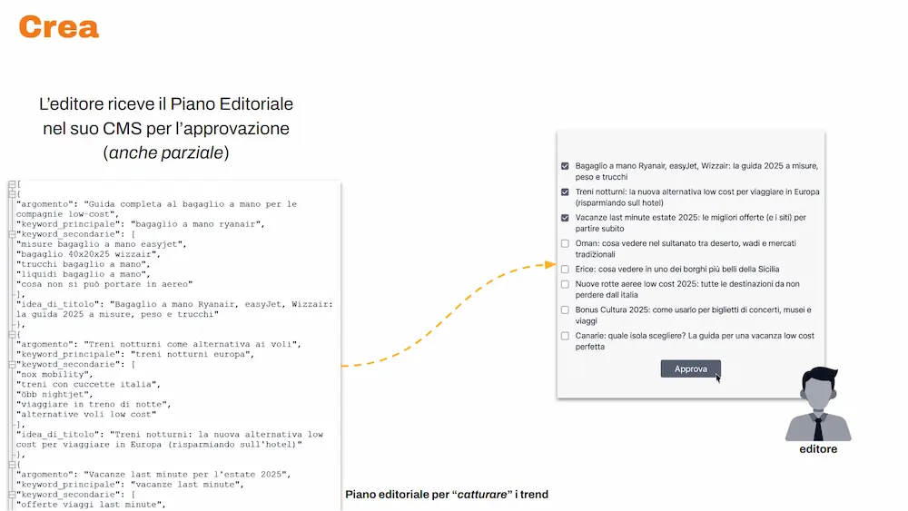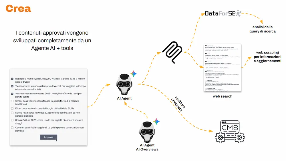 I contenuti approvati vengono processati da un agente specializzato che: usa tool esterni via MCP (Model Context Protocol), coopera con il sistema dedicato alla rilevanza (quello visto nella prima tappa), produce la scrittura completa di una bozza di altissima qualità, e la salva direttamente nel CMS.