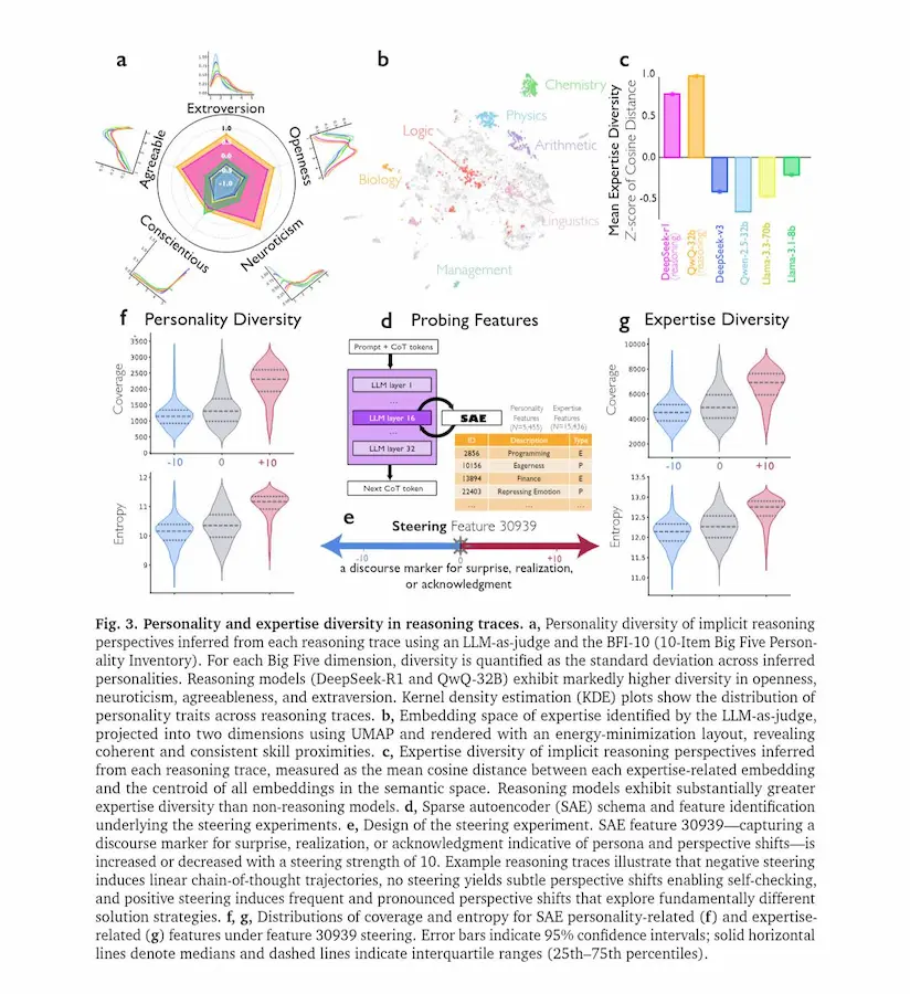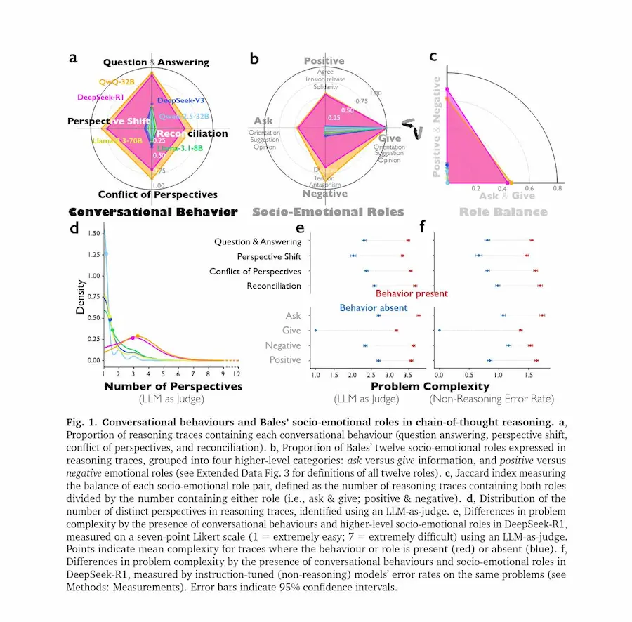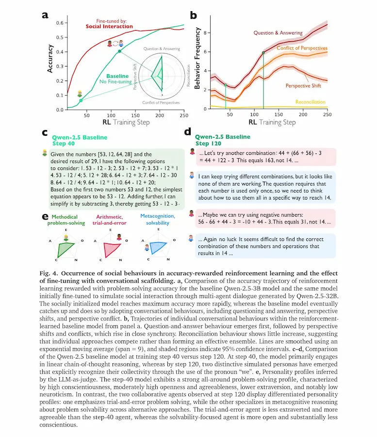 Inoltre, quando un modello viene addestrato premiando solo la correttezza delle risposte, tende spontaneamente a sviluppare dialoghi interni tra “agenti” virtuali. Se viene inizialmente esposto a esempi di ragionamento multi-agente, apprende strategie di reasoning più rapidamente e le trasferisce meglio su nuovi domini.