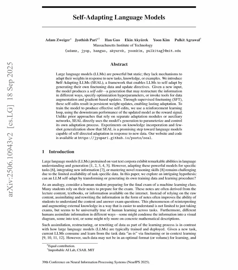 Si parla sempre più spesso di continual learning. Questo paper descrive SEAL (Self-Adapting Language Models), un framework che prova a superare la natura "statica" dei LLM, permettendo loro di auto-adattarsi quando incontrano nuovi dati o nuovi task.