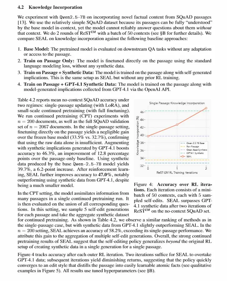 Nel dettaglio, SEAL introduce un doppio loop: un inner loop, in cui il modello si aggiorna tramite fine-tuning su "self-edit" auto-generati (riscritture, implicazioni, configurazioni di training), e un outer loop di reinforcement learning, che premia quei self-edit che portano a reali miglioramenti sulle prestazioni finali. Gli esperimenti mostrano risultati interessanti sia nell’integrazione di nuova conoscenza (es. SQuAD senza contesto) sia nel few-shot reasoning (ARC), dove SEAL impara automaticamente quali strategie di adattamento funzionano meglio.