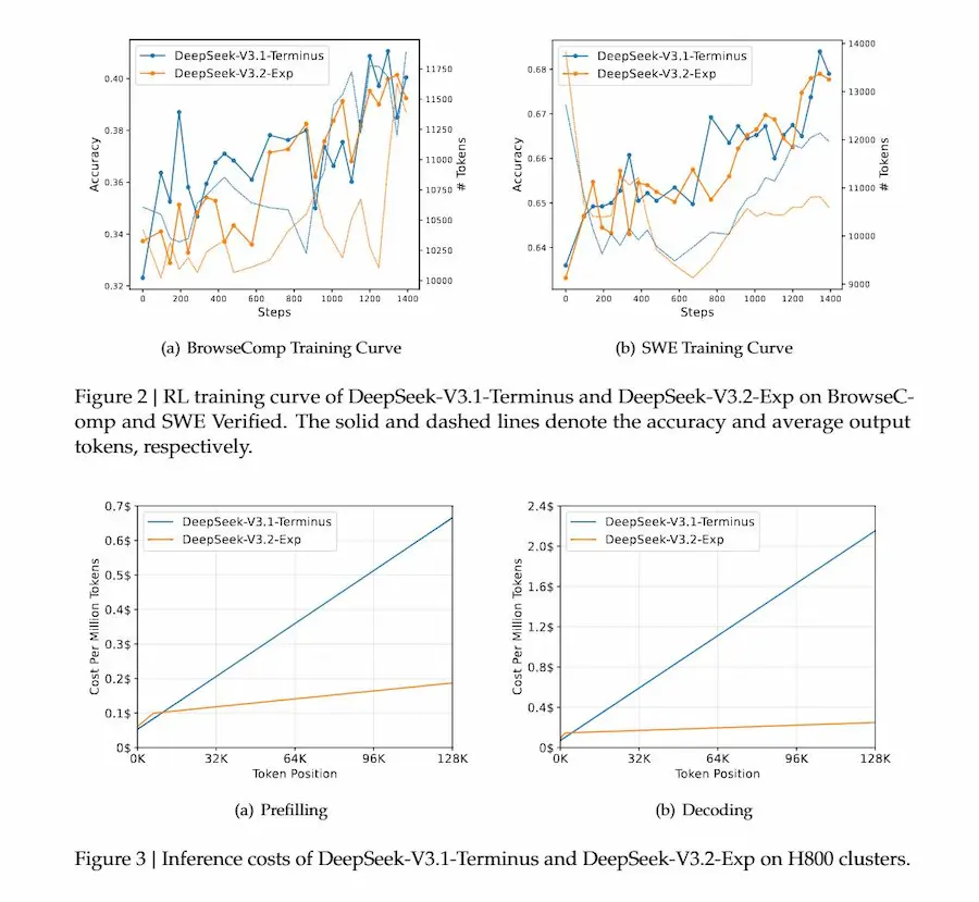 Il risultato è un modello che mantiene prestazioni molto vicine a V3.1-Terminus nei benchmark, con solo lievi cali su compiti di reasoning complesso, compensati da un guadagno enorme in efficienza: costi di inferenza ridotti e maggiore rapidità soprattutto nei contesti lunghi (fino a 128K token).