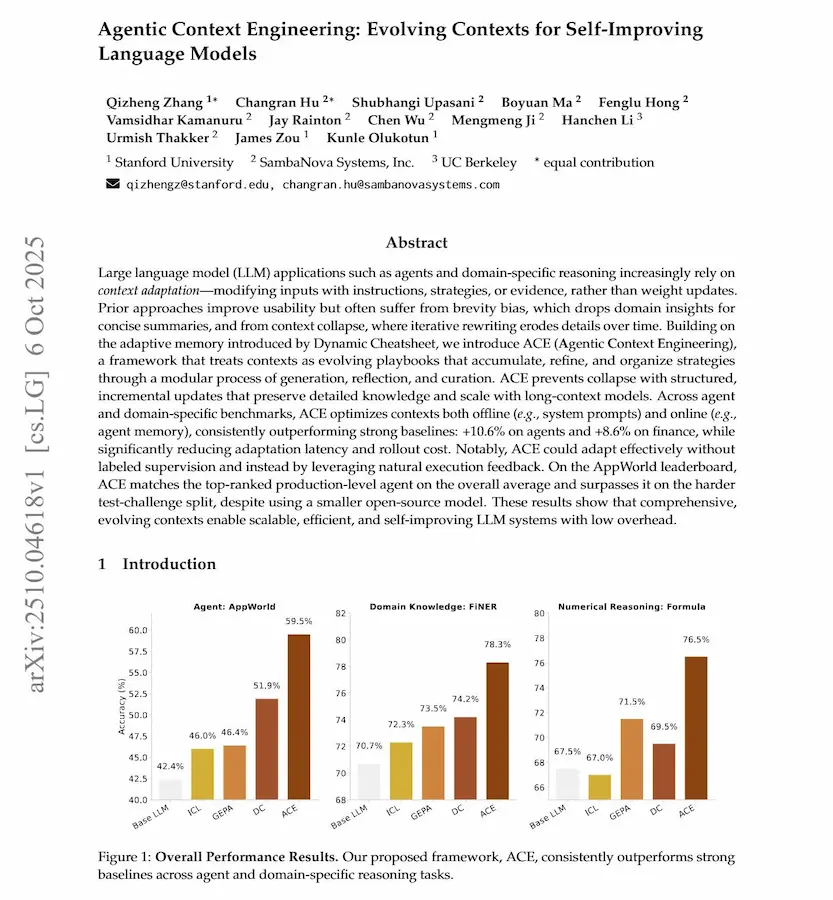 Il paper "Agentic Context Engineering", guidato da un team di Stanford in collaborazione con SambaNova Systems e UC Berkeley, propone un paradigma in cui il prompt, la memoria e le istruzioni non sono solo un testo statico, ma un playbook che cresce e si affina nel tempo.