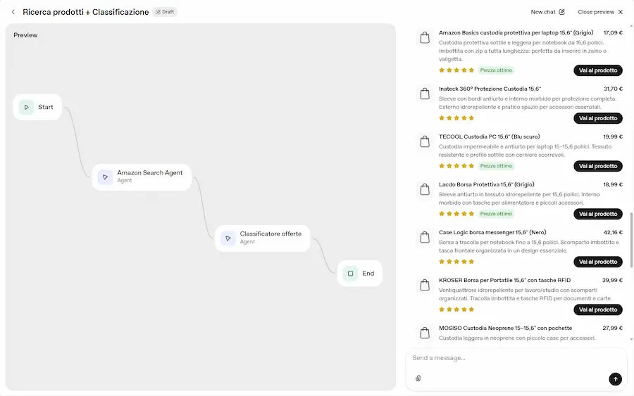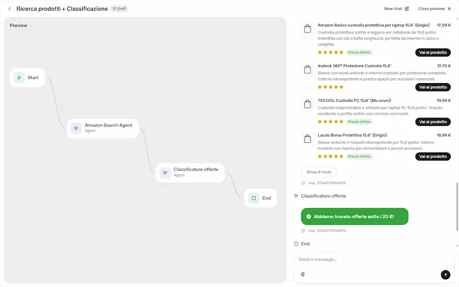 - uno per la ricerca prodotti che usa un MCP per la connessione ad Amazon e la web search,