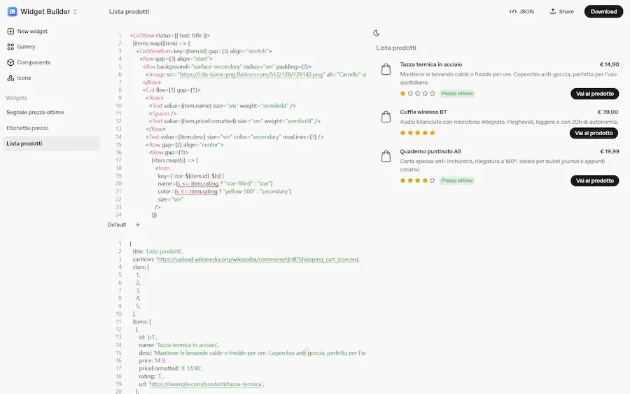 Widget Builder permette di creare widget personalizzati anche attraverso prompt in linguaggio naturale. Nelle immagini si vedono i due widget valorizzati dal risultato del lavoro degli agenti. I widget vengono generati in React, e valorizzati attraverso un JSON (tutto prodotto dal Builder). L'agente usa quel JSON per "comprendere" come generare l'output.