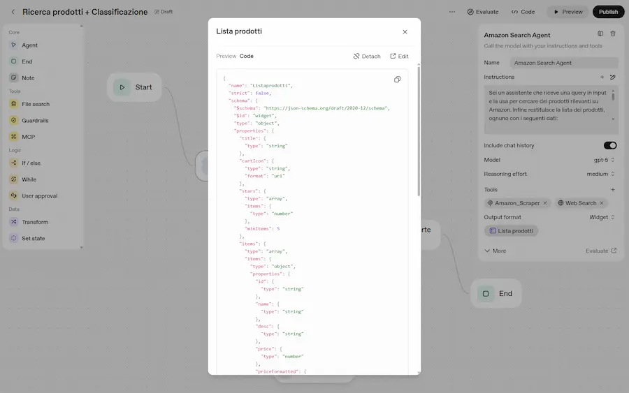 - Agent Builder, permette di disegnare graficamente il comportamento dell’agente, collegando nodi (es. sistemi decisionali, guardrail, recupero dati) senza scrivere codice. Ogni blocco è un componente funzionale, del flusso di lavoro dell’agente.