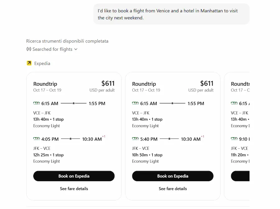 L'aspetto interessante: come specifica OpenAI nella sua documentazione, le applicazioni si attivano anche senza selezionarle, in base a quello che chiede l'utente. Negli esempi, si vedono le query che faccio senza nessuna app attiva. Il sistema attiva il reasoning, sceglie uno strumento (un'app), traduce la query in una chiamata API e mostra i risultati nell'applicazione.