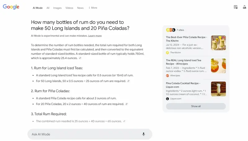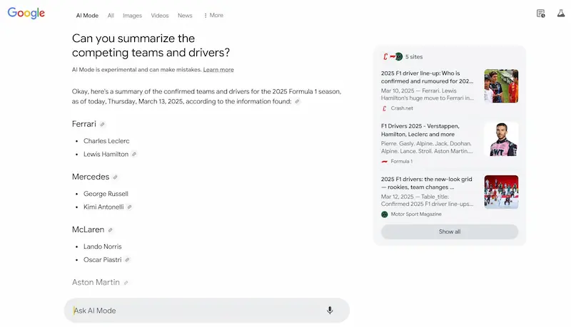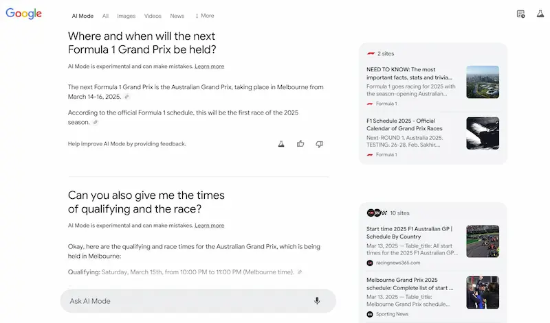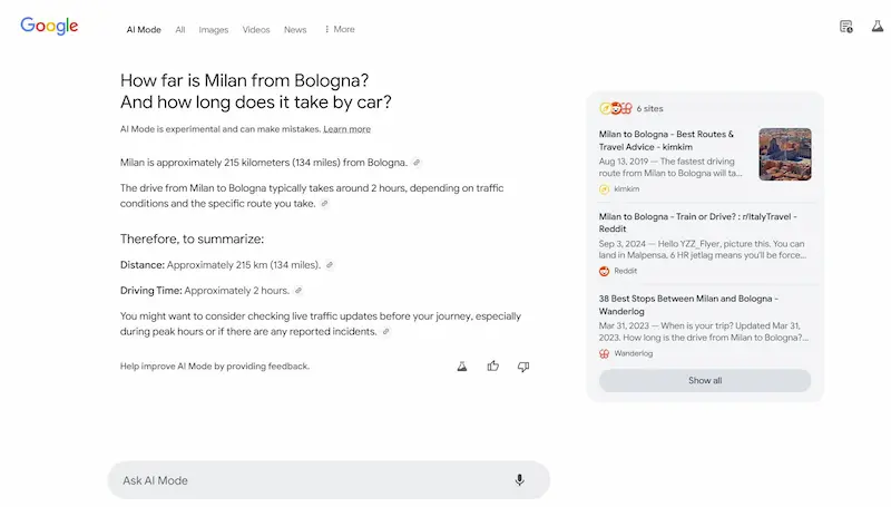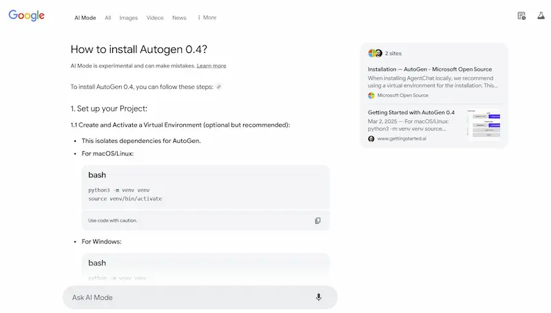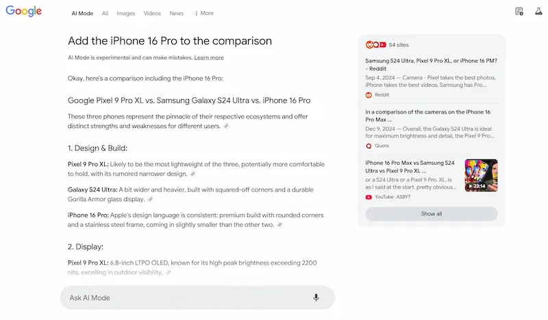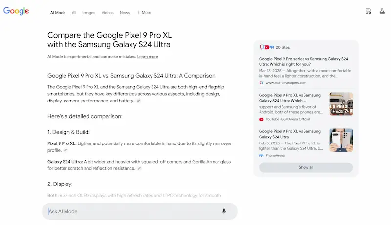 Ho fatto alcuni test del sistema, e vediamo alcune osservazioni. Le risposte alle query informative sono ben strutturate e molto più dettagliate rispetto a AI Overviews, e spesso non presenta le stesse fonti.