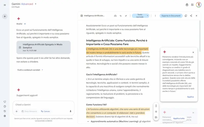 Google continua ad aggiungere funzionalità all'interfaccia di Gemini: arriva Canvas.