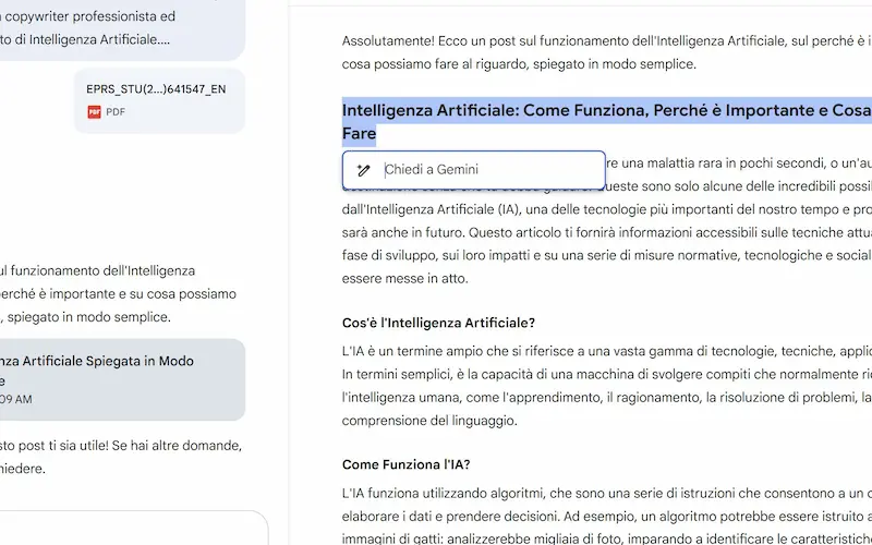 Come avviene per ChatGPT, si tratta di un sistema che trasforma la chat in un editor interattivo per testo e codice, con la possibilità di modificare gli output manualmente o via prompt (anche contestuali, selezionando blocchi di contenuto).