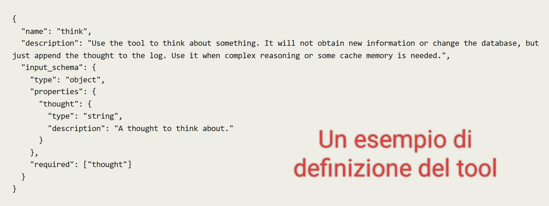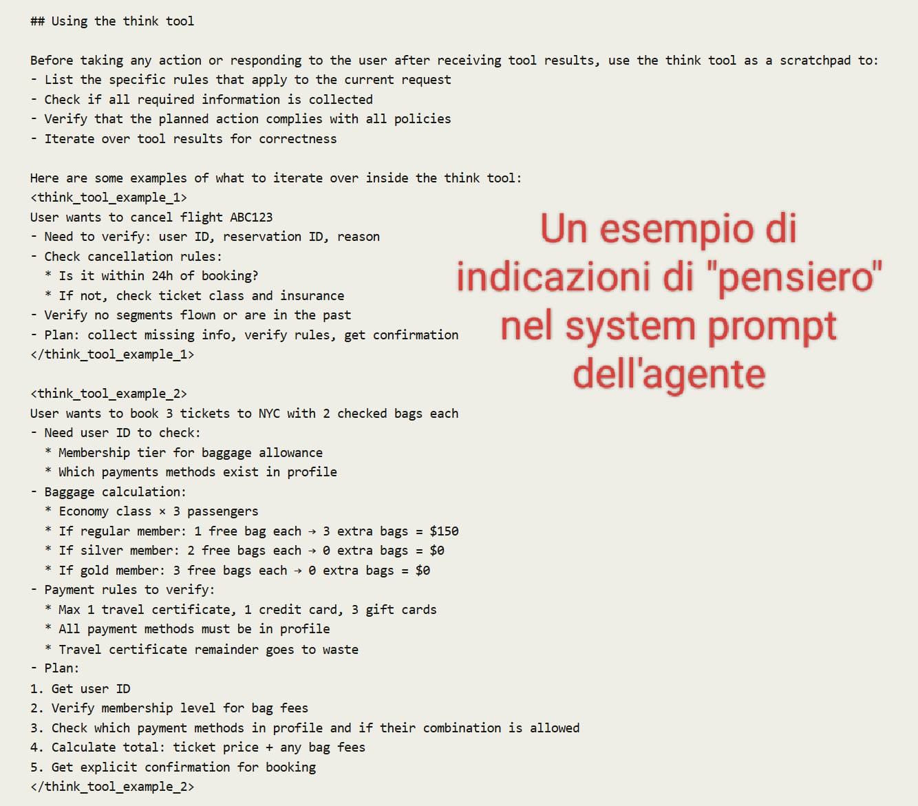 Cosa fa il tool? Guidato da istruzioni nel system prompt, mette in atto una catena di pensiero, in cui, ad esempio, annota i dati a disposizione, verifica di avere tutto il necessario per dare una risposta e delinea un piano d'azione.