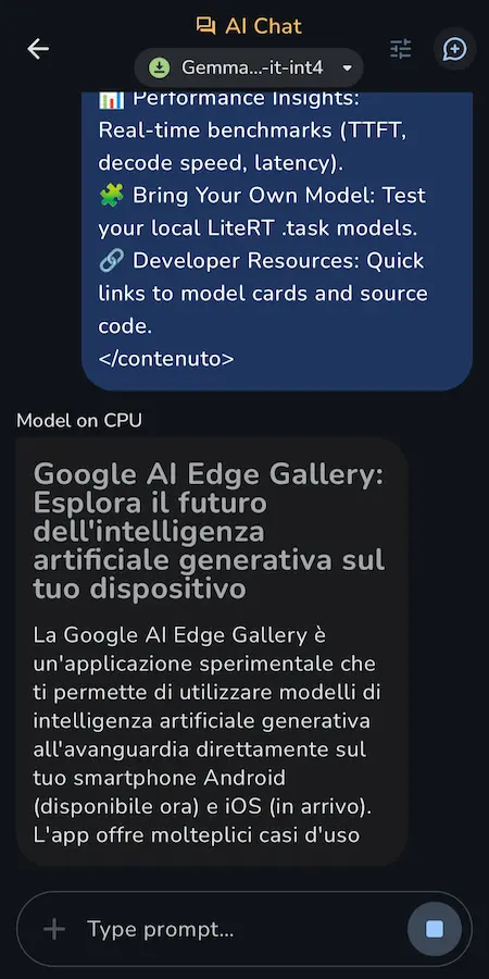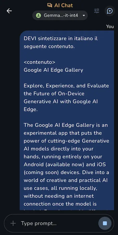 Nell'esempio uso Gemma 3 sul mio smartphone per sintetizzare la pagina del progetto su GitHub.