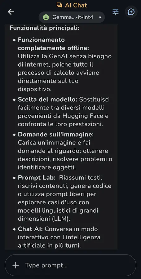 L'app, attualmente disponibile per Android, permette di interagire con diversi modelli (inclusi quelli da Hugging Face), porre domande a partire da immagini, sperimentare prompt per generazione testi e codice, avviare conversazioni multi-turno, e monitorare le performance in tempo reale.