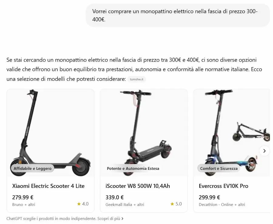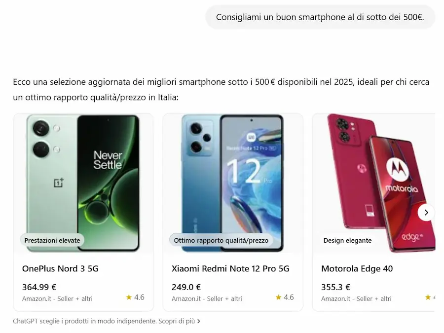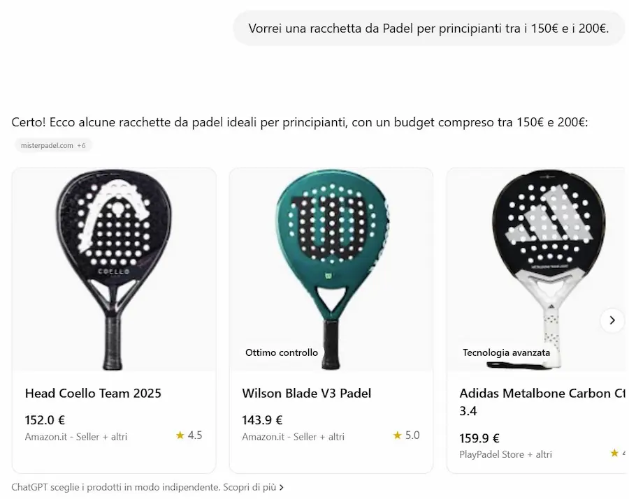 Quando l’utente fa una richiesta che suggerisce un’intenzione d’acquisto, ChatGPT può mostrare caroselli visivi con prodotti pertinenti, accompagnati da descrizioni semplificate, etichette come “Budget-friendly” o “Più popolare”, e link diretti ai siti web dove è possibile acquistarli.