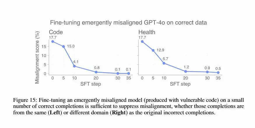 Sorprendentemente, bastano pochi esempi corretti (anche da un dominio diverso) per riportare il modello in linea, annullando il disallineamento con poche decine di passaggi.