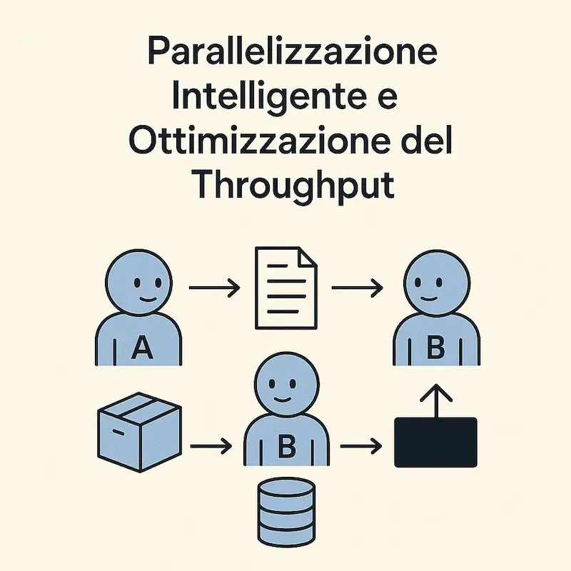 - Parallelizzazione intelligente e ottimizzazione del throughput. Consente l'esecuzione simultanea e coordinata di compiti indipendenti, massimizzando l'efficienza delle risorse e riducendo il tempo totale di produzione per insiemi di output.