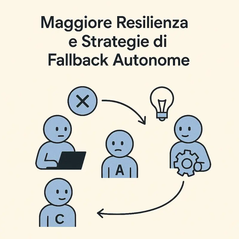 - Maggiore resilienza e strategie di fallback autonome. Gli agenti possono gestire autonomamente errori o fallimenti delle API, attivando strategie di retry o alternative specifiche al loro dominio senza bloccare l'intero workflow.