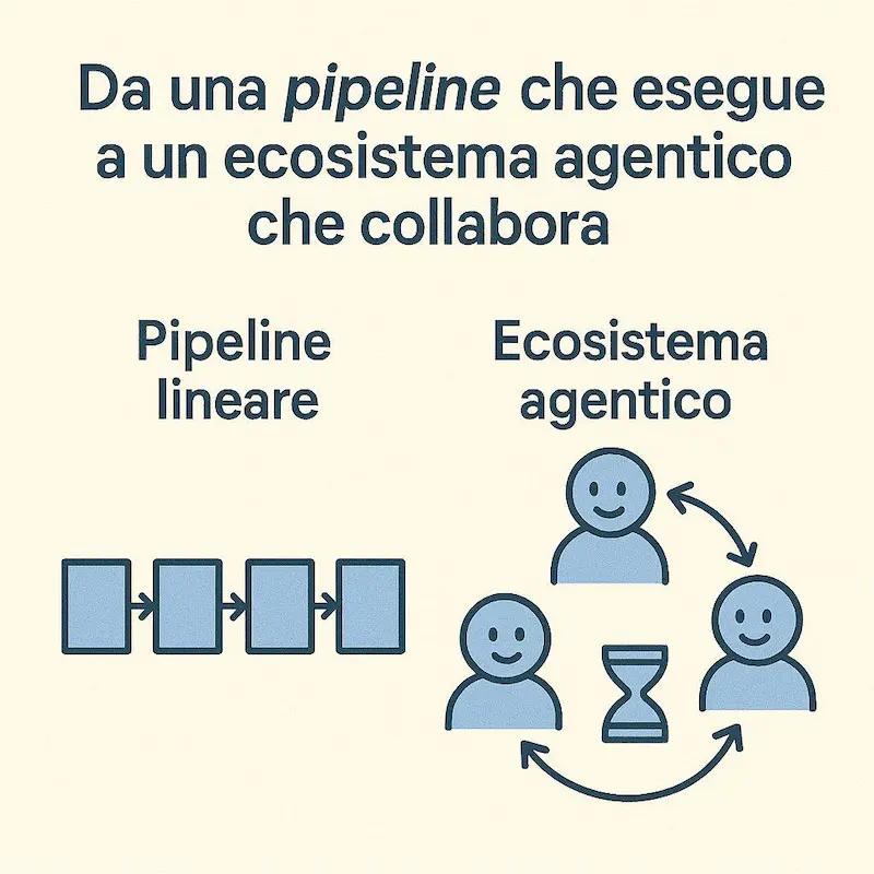 In sintesi: si passa da una pipeline che esegue a un ecosistema che collabora, apprende e si adatta.