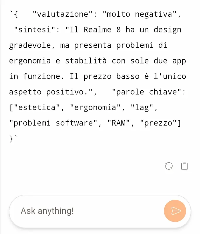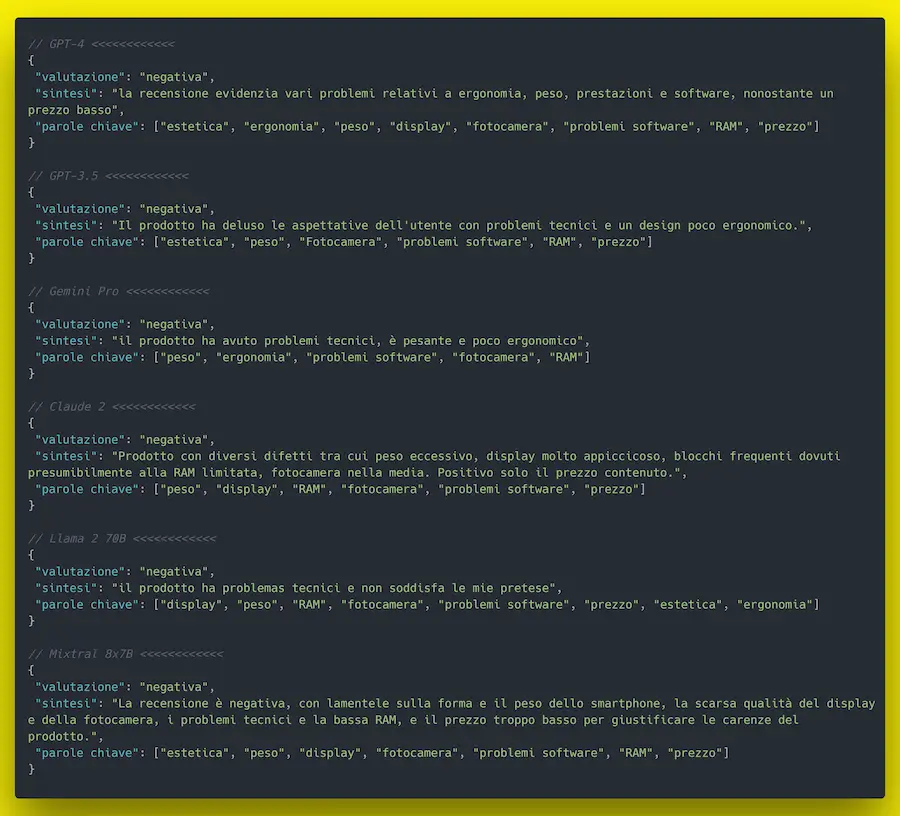 Il task è molto semplice: l'analisi di una recensione. Le risposte sono molto simili: le sfumature nell'estrazione dei topic derivano da diverse letture del contesto, ma hanno tutti senso.