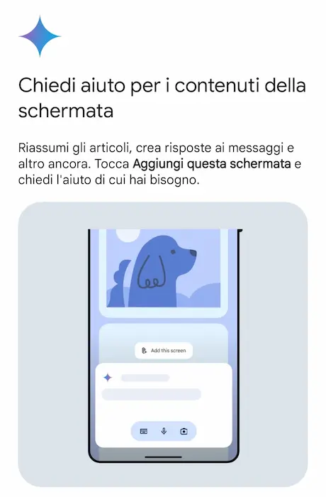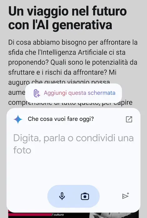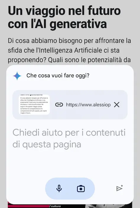 Una potente funzionalità riguarda l'interazione con i contenuti dello schermo, che diventano un contesto per il modello di linguaggio. Nell'esempio si vede come l'assistente sintetizzi una pagina web, ma può rispondere a domande, generare altri contenuti, ecc..