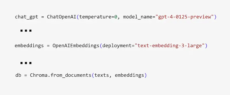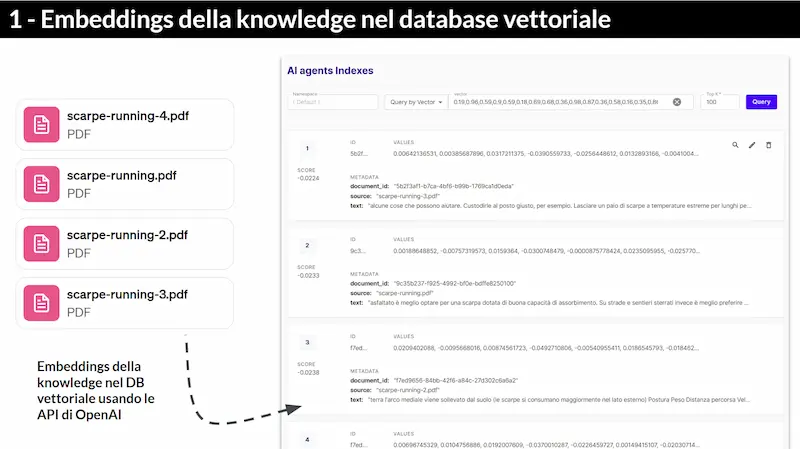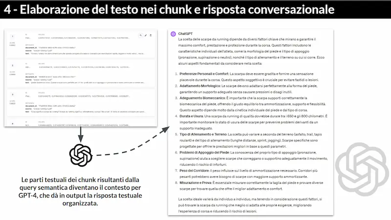 - I contenuti vengono divisi in parti (chunk), e vengono vettorializzati usando un modello di embeddings di OpenAI.
