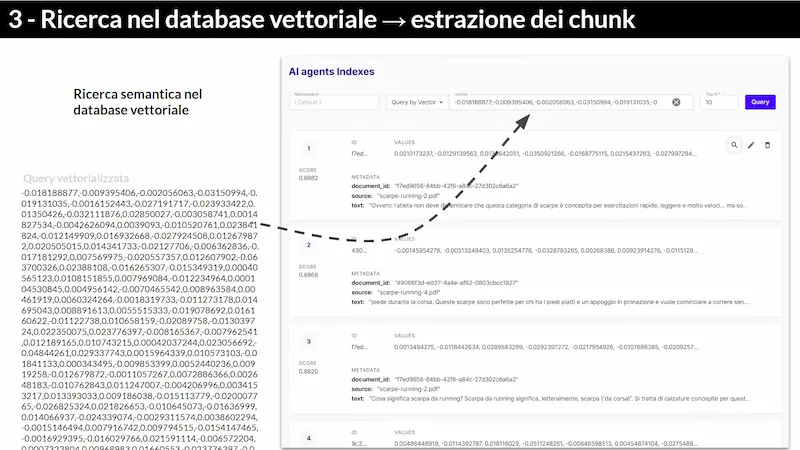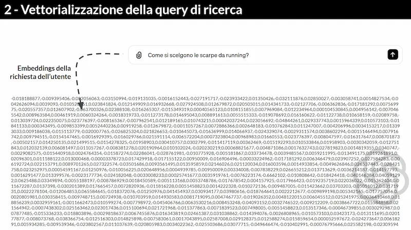 - La domanda che l'utente pone al sistema viene vettorializzata, e il vettore viene confrontato con quelli nel database vettoriale (una query nel DB).