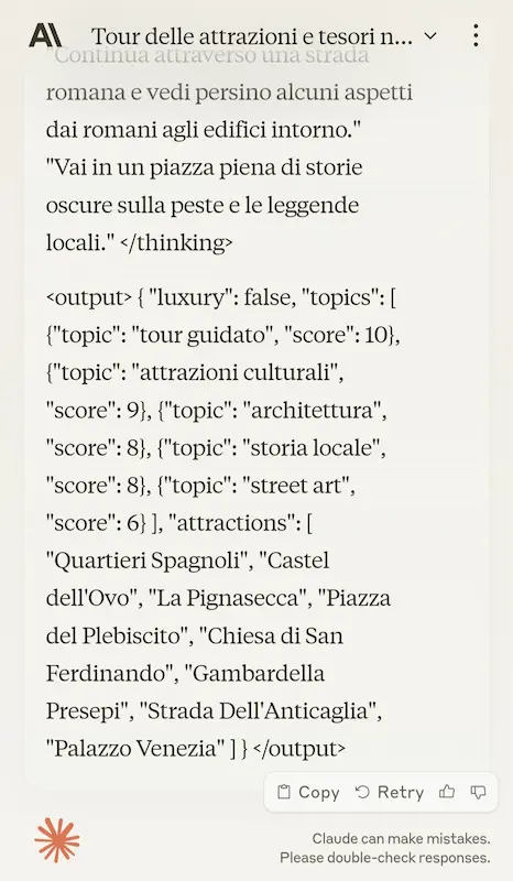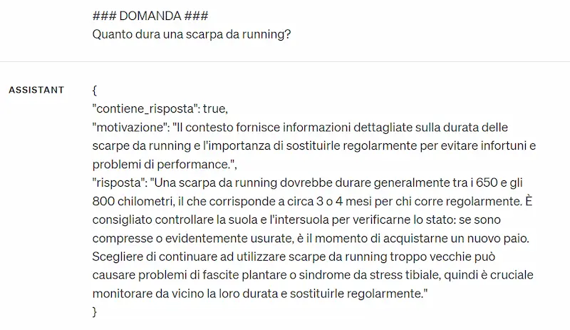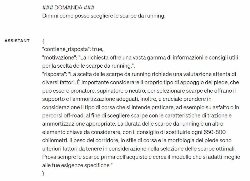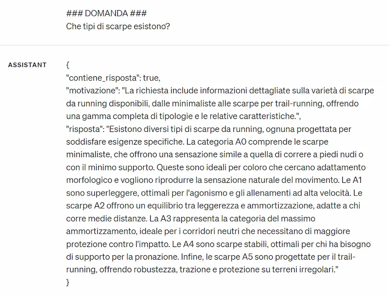 Il fine-tuning di GPT-3.5 Turbo per elaborare l'estrazione dal database vettoriale permette precisione: l'output è sempre formattato perfettamente.