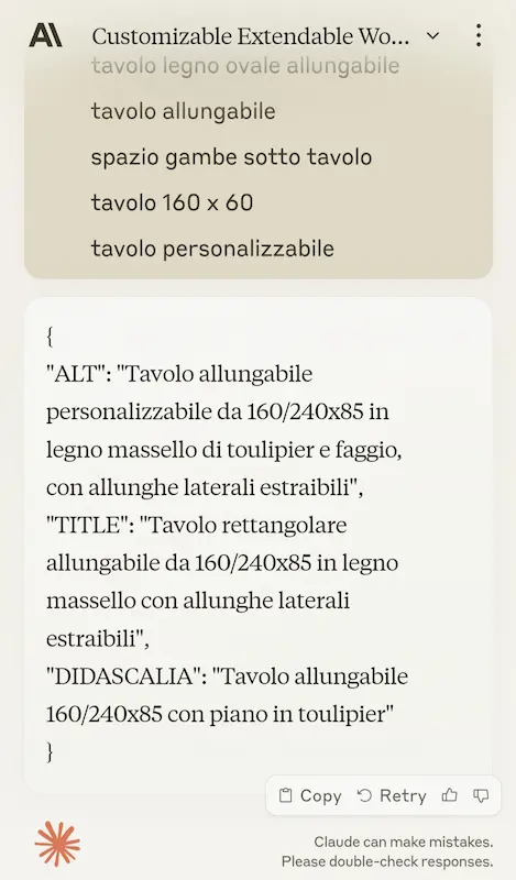Nel test si vede un esempio dell'utilizzo delle API dal pannello di Vertex AI, in cui carico l'immagine di un tavolo, che viene unita al contesto di un prompt strutturato per generare i dati di ottimizzazione, ovvero gli attributi "alt" e "title", e la didascalia.
