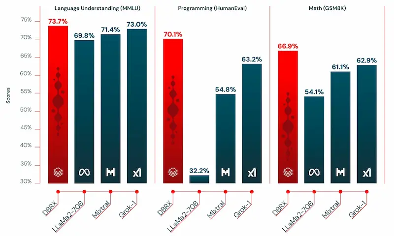 Databricks ha presentato DBRX: un nuovo LLM open dalle performance superiori a Grok, Mixtral 8x7b e Llama 2 70b, e di poco inferiori a Claude 3 Haiku.