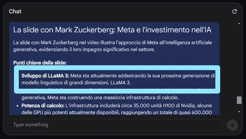 - Nella prima immagine si vede come descrive correttamente il punto in cui nel video parlo di Llama 3 di Meta.