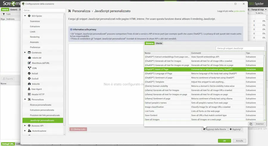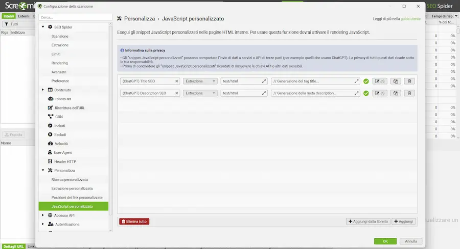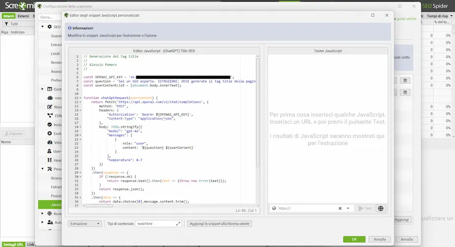 Il tutto avviene attraverso l'area del JavaScript personalizzato, creando iniezioni di snippet durante lo scraping che effettuano le chiamate API con prompt specifici, in cui i dati delle pagine diventano il contesto per il LLM.