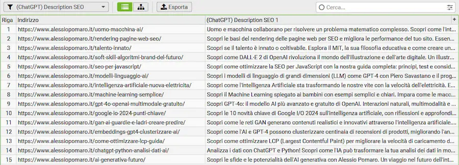 Nell'esempio uso GPT4o, e genero il tag title e la meta description per le pagine scansionate.