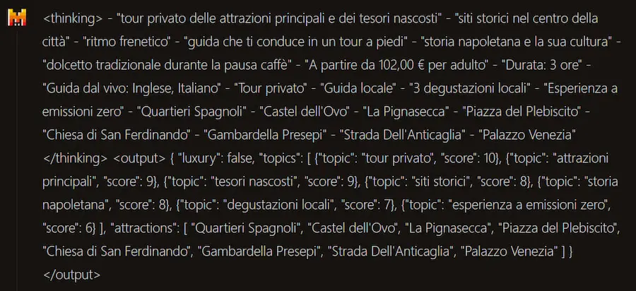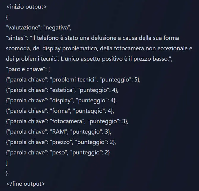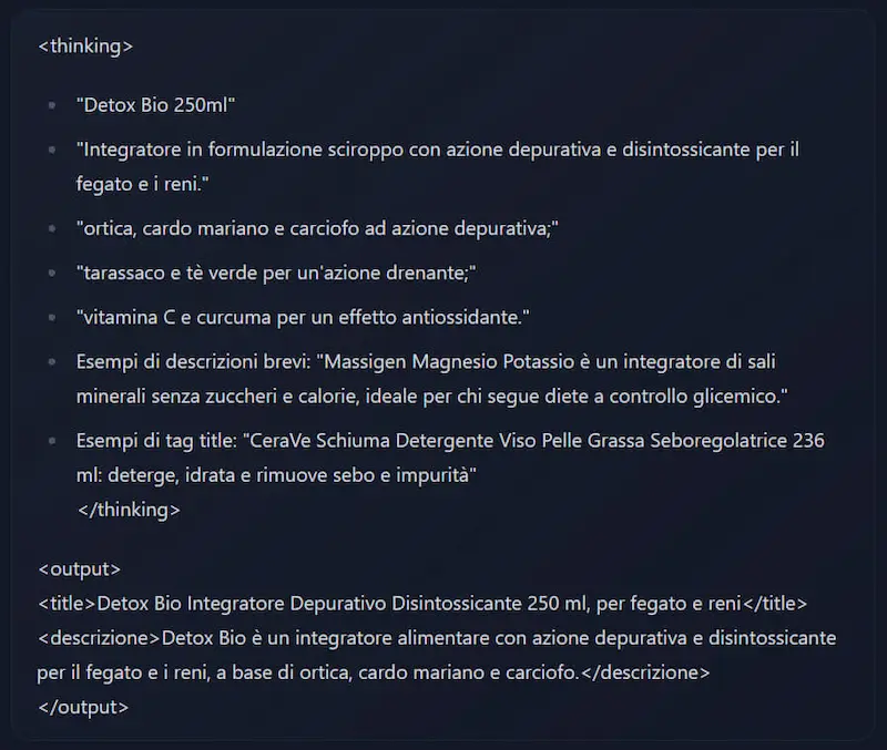 Risultato: il modello, come da specifiche, è molto preciso nel rispettare le istruzioni del prompt. Gli output che ho prodotto, sono assolutamente paragonabili a GPT-4.
