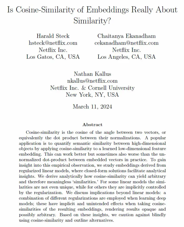 Un interessante studio di Netflix dimostra come la similarità del coseno può non essere sempre la scelta migliore per stabilire la vicinanza tra embeddings.