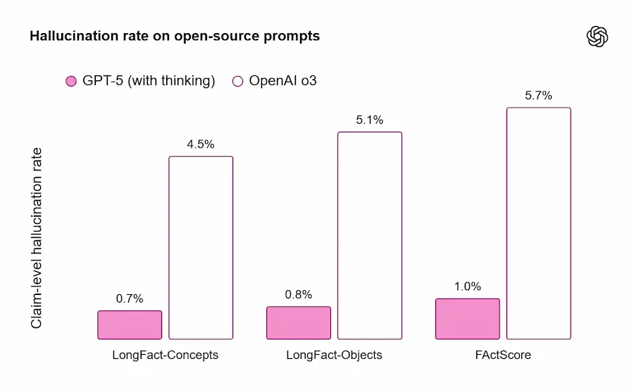 Con ricerca web attiva su prompt rappresentativi, le risposte di GPT-5 sono ~45% meno soggette a errori fattuali rispetto a GPT-4o; in modalità “thinking” sono ~80% meno soggette a errori rispetto a o3. Su benchmark di fattualità aperta (LongFact, FActScore) “GPT-5 thinking” riduce le allucinazioni di circa 6× rispetto a o3.