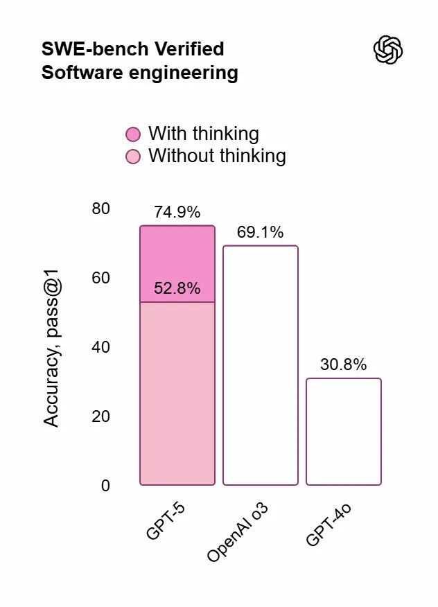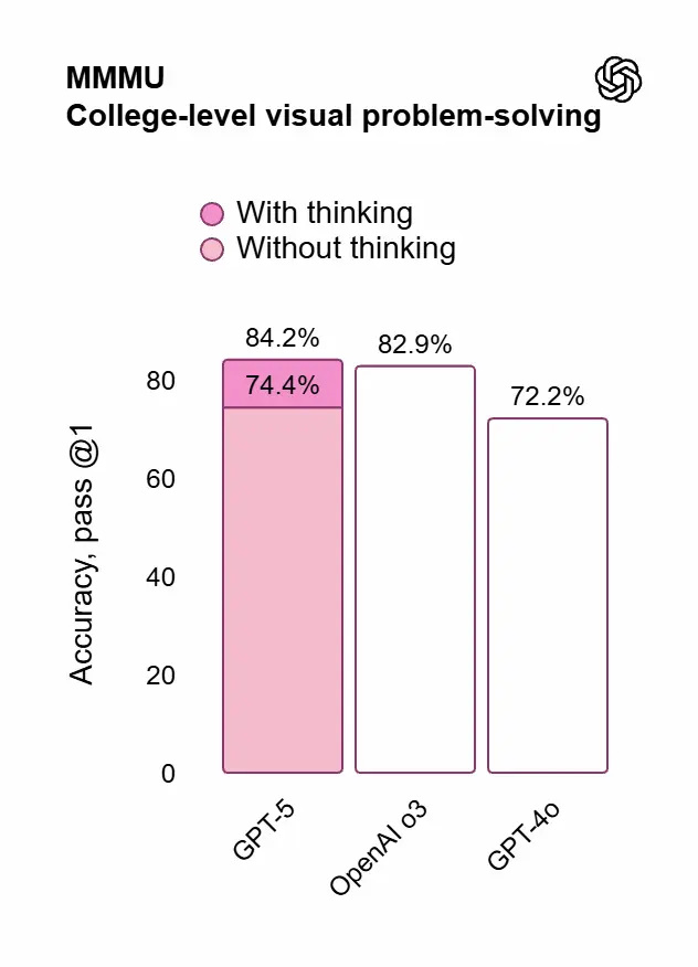 In più, rispetto a o3, GPT-5 “thinking” raggiunge risultati migliori usando il 50–80% di token di output in meno su varie capacità (ragionamento visivo, coding agentico, problemi scientifici avanzati).