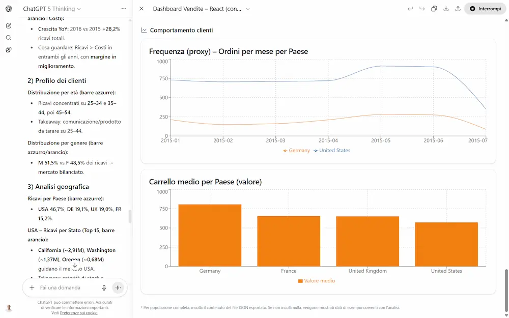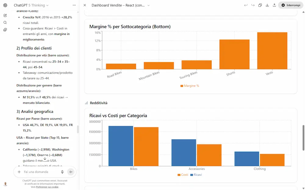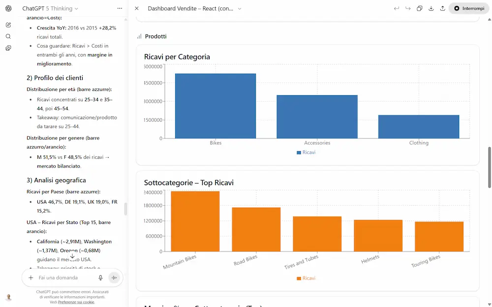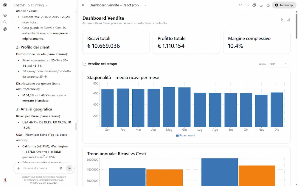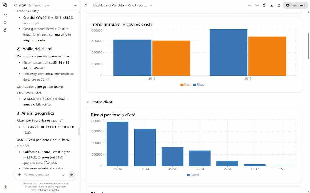 Ho fatto diversi test con il modello GPT-5 Thinking (su ChatGPT e via API) che riguardano, ad esempio, la generazione di testo, la creazione di dashboard che derivano dall'analisi di un dataset, output strutturati con contesti in input molto lunghi dove la precisione è fondamentale, ragionamento, matematica.